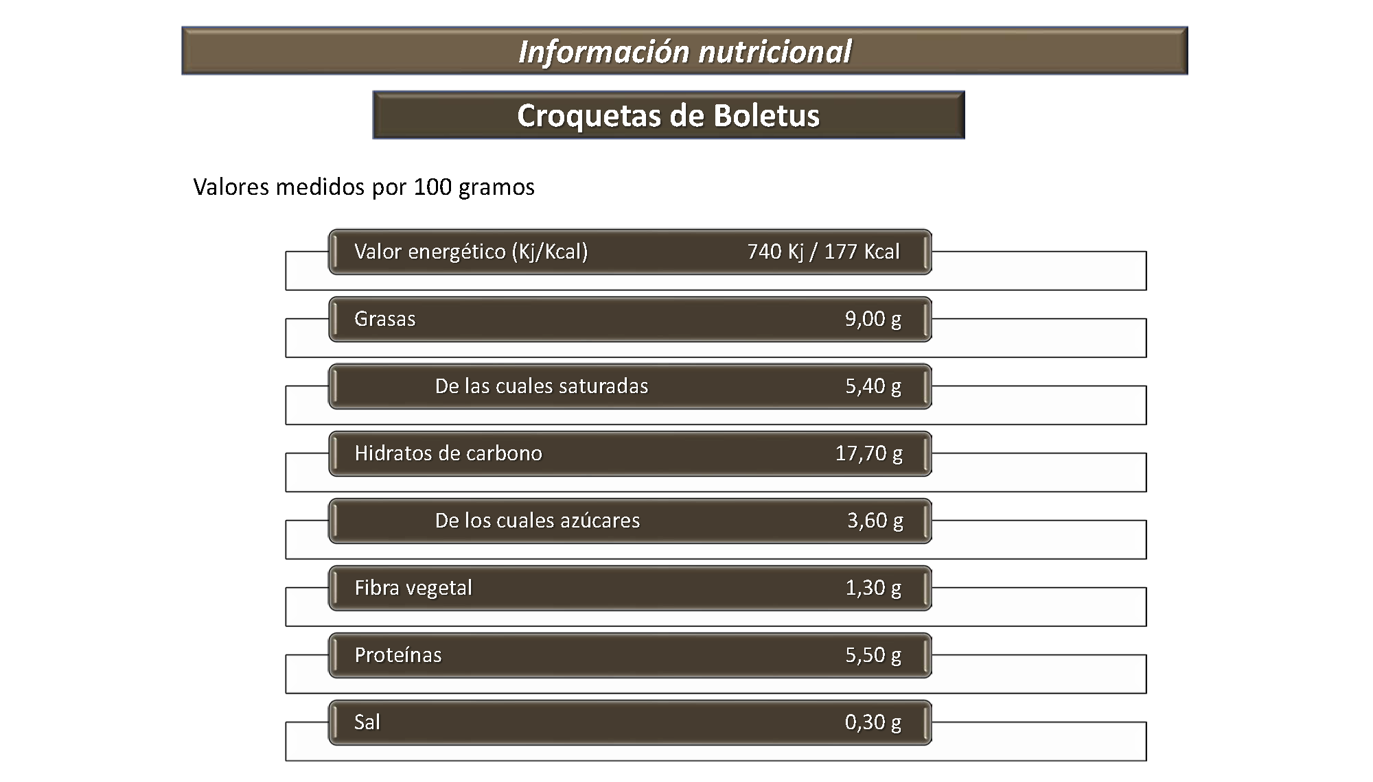 Boletus edulis (boletus edulis silvestres), harina de boletus (boletus edulis silvestres (deshidratado), mantequilla (nata pasteurizada y fermentos lácticos), leche (leche semidesnatada), nata (almidón modificado, estabilizante (carragenano), harina, sal, gelatina, encolante (harina de maíz, almidón de maíz, sal, goma guar, xantana), pan micronizado (harina de trigo, agua, levadura), pan rallado (harina de trigo, sal, gluten de trigo, agua, aceite de oliva, levadura, gasificantes (e-450i, e-500i)