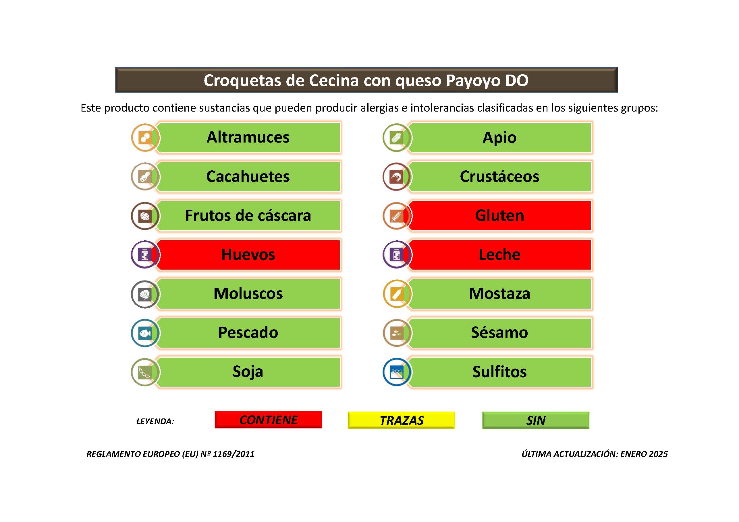 Queso Payoyo (leche pasteurizada de cabra, sal, cuajo, estabilizantes, cloruro cálcico, fermentos lácticos y conservantes. lisozima de huevo), cecina (carne de vaca, sal, azúcar, corrector de acidez (e-331), conservadores (e-252 y e- 250)), mantequilla (nata pasteurizada y fermentos lácticos), leche (leche semidesnatada), nata (almidón modificado, estabilizante (carragenano)), harina, sal, gelatina, encolante (harina de trigo, almidón de trigo, sal, espesante(e-464).), pan micronizado (harina de trigo, agua, levadura.), pan rallado (harina de trigo, sal, gluten de trigo, agua, aceite de oliva, levadura, gasificantes (e-450i, e-500i))
