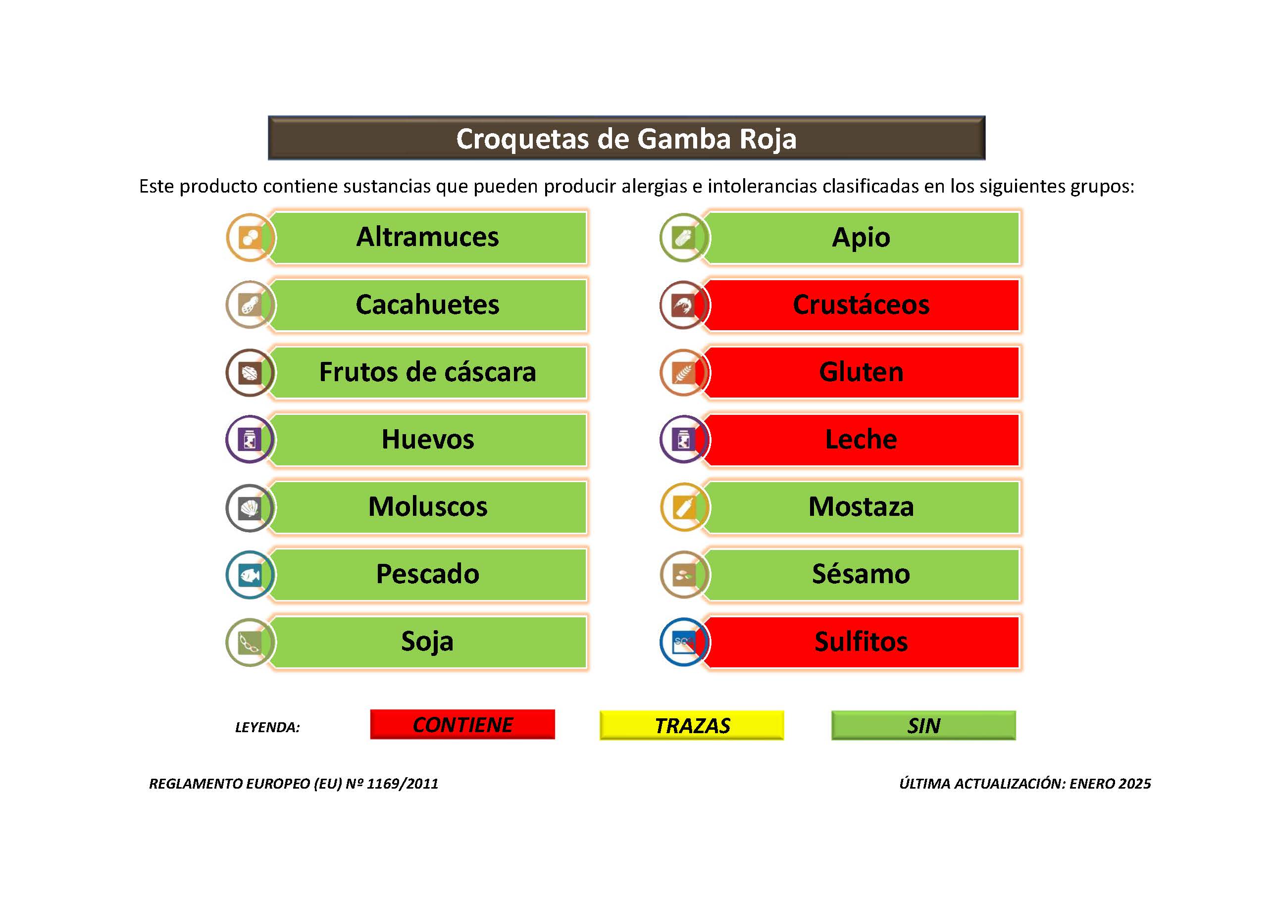 Gamba roja (antioxidantes (e-450i,e-331ii,e-330,223,(sulfitos)), chalota caramelizada (chalota, mantequilla, sal), mantequilla (nata pasteurizada y fermentos lácticos), leche, nata (almidón modificado, estabilizante (carragenano), harina, sal, gelatina, encolante (harina de trigo, almidón de trigo, sal, espesante(e-464), pan cracker (maíz tostado (maíz, sal, extracto de malta).harina de trigo, agua, levadura (puede contener trazas de solidos lácteos), pan micronizado (harina de trigo, agua, levadura), copos de patata (patata, e-471.)