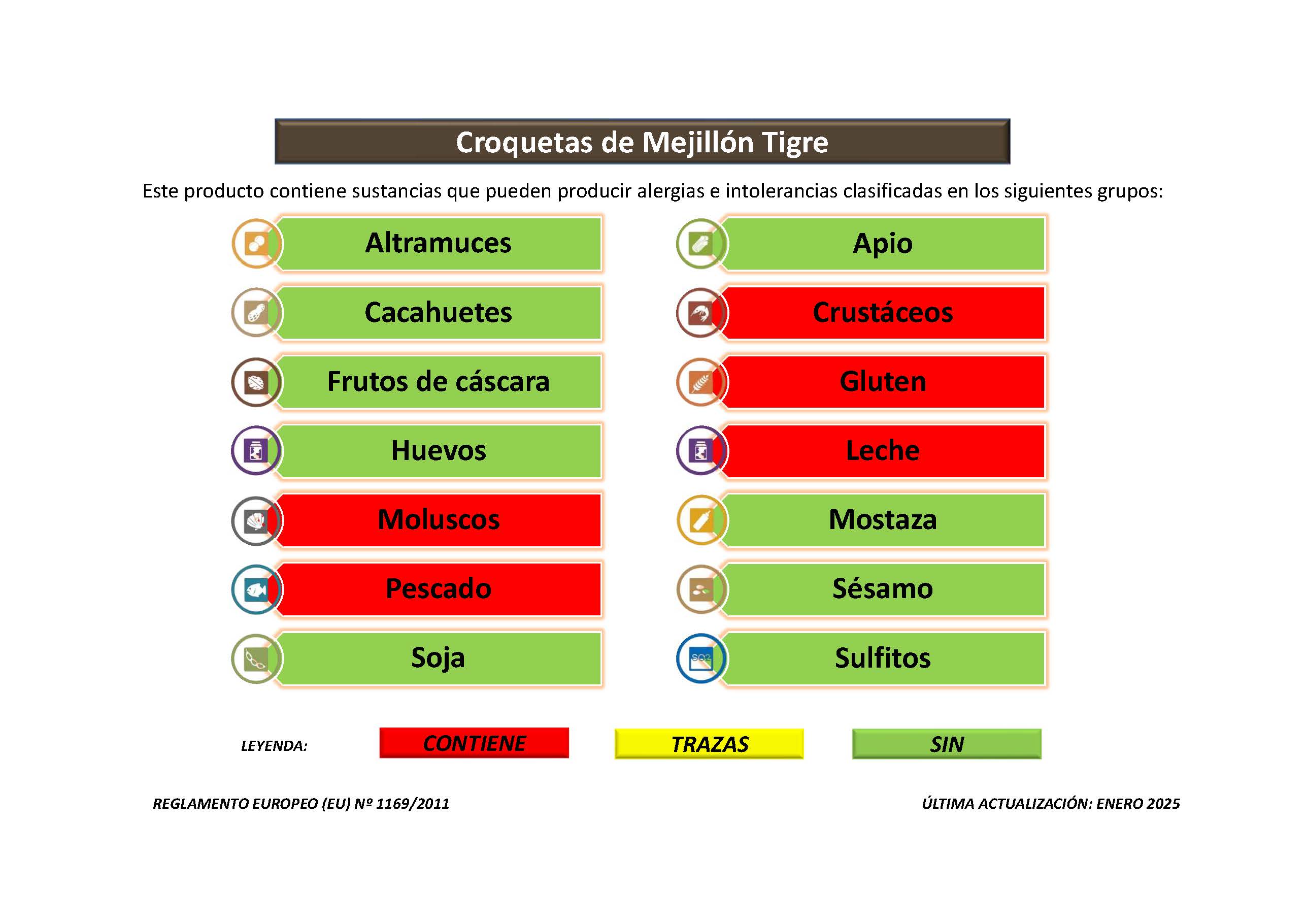 Mejillón, carne de mejillón, pimiento verde, puerro, ajo, tomate concentrado (tomate, sal), pimentón picante, mantequilla (nata pasteurizada y fermentos lácticos), leche (leche semidesnatada), nata (almidón modificado, estabilizante (carragenano)), harina, sal, gelatina (encolante. (harina de trigo, almidón de trigo, sal, espesante(e-464)), pan cracker, harina de trigo, agua, levadura (puede contener trazas de solidos lácteos), pan micronizado (harina de trigo, agua, levadura)