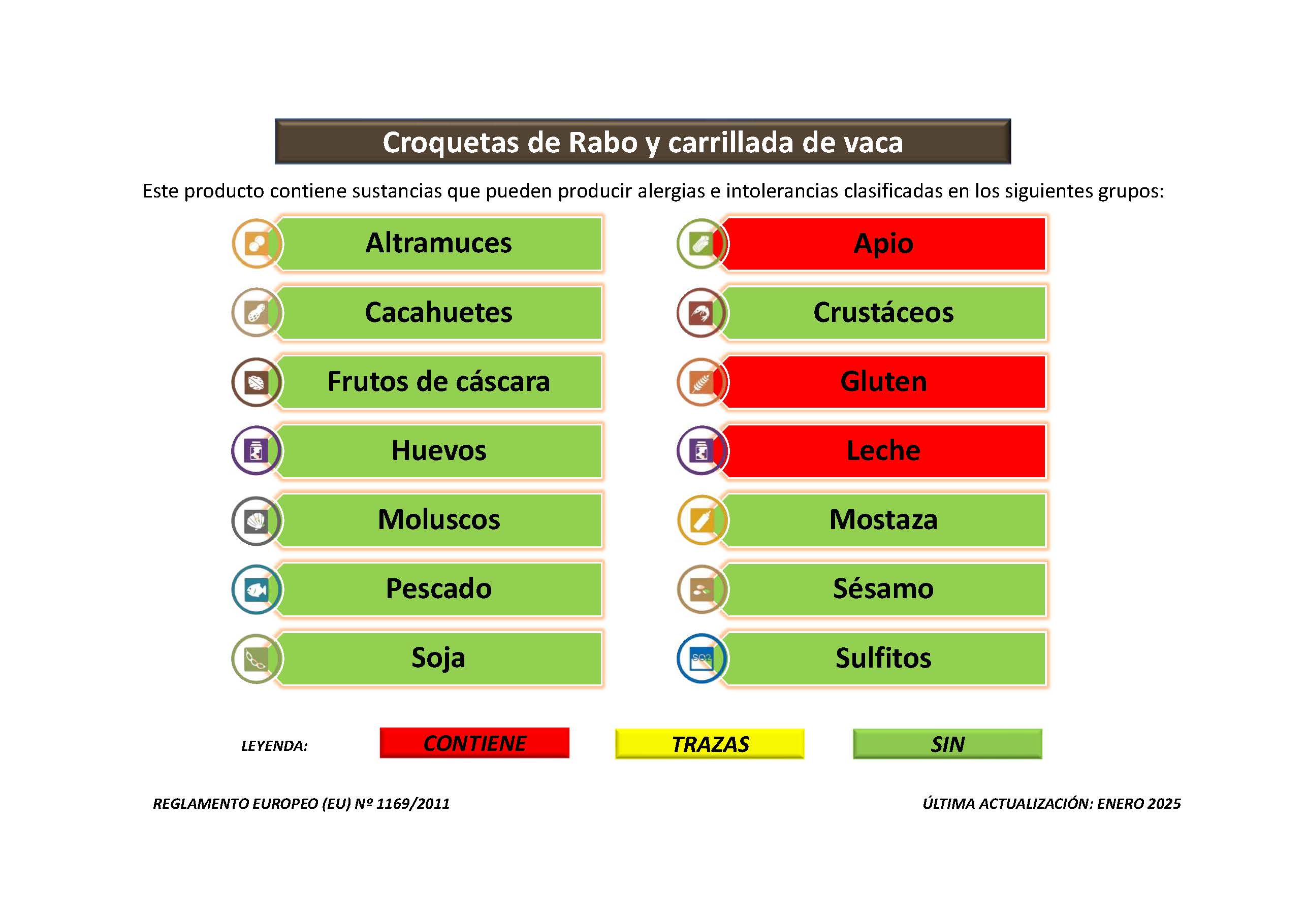 Rabo de vaca, carrillada de vaca, vino tinto, mantequilla (nata pasteurizada y fermentos lácticos), leche (leche semidesnatada), harina, gelatina, sal, pan micronizado (harina de trigo, agua, levadura.), pan rallado (harina de trigo, sal, gluten de trigo, agua, aceite de oliva, levadura, gasificantes (e-450i, e-500i).), encolante (harina de maíz, almidón de maíz, sal, goma guar, xantana)