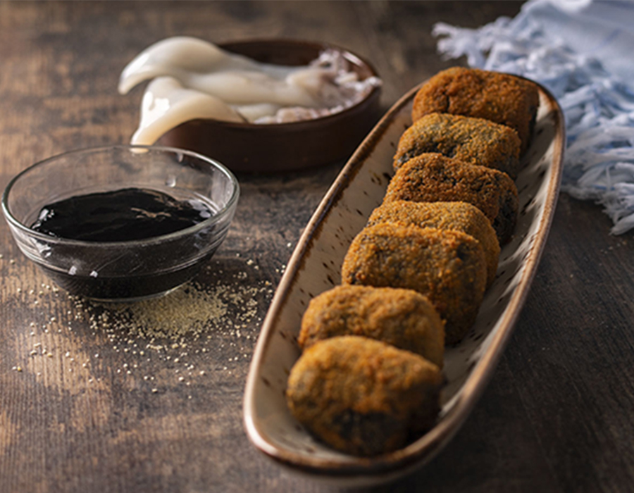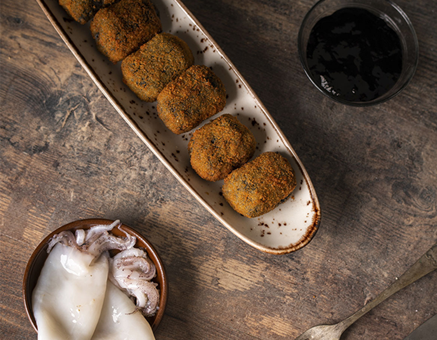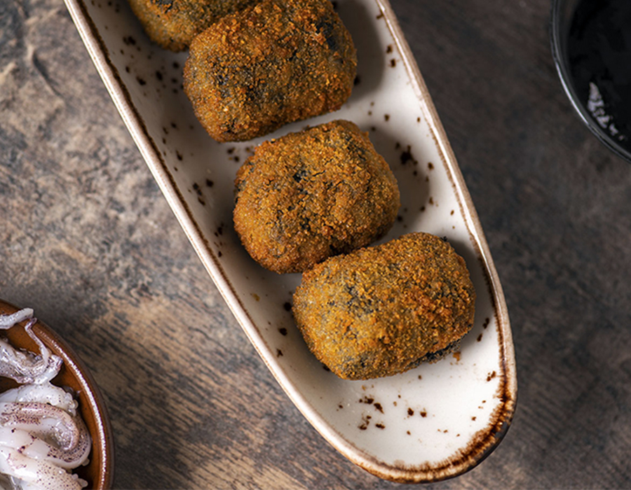 Una receta que surge del afán y tesón por trasformar los platos más tradicionales. Perfecta para servir como tapa, guarnición o aperitivo. El color es la nota especial, pero lo que te gana de esta croqueta es su sabor, en el que domina con protagonismo el calamar.