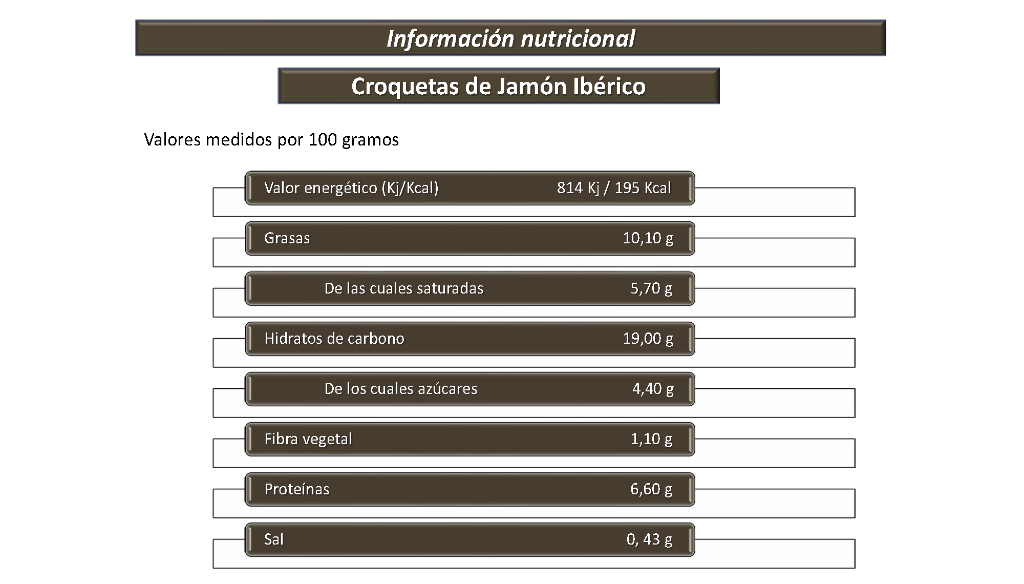 Jamón de bellota 100% ibérico (jamón de cerdo, sal nitrato potásico e-252, nitrato sódico e-250, eritobato sódico e-316, azúcar), mantequilla (nata Pasteurizada y fermentos lácticos), leche (leche semidesnatada), nata (almidón modificado, estabilizante (carragenano), harina, sal, gelatina, pan Micronizado (harina de trigo, agua, levadura), pan rallado (harina de Trigo, sal, gluten de trigo, agua, aceite de oliva, levadura, gasificantes (e-450i, e-500i)), encolante (harina de maíz, almidón de maíz, sal, goma guar, Xantana)